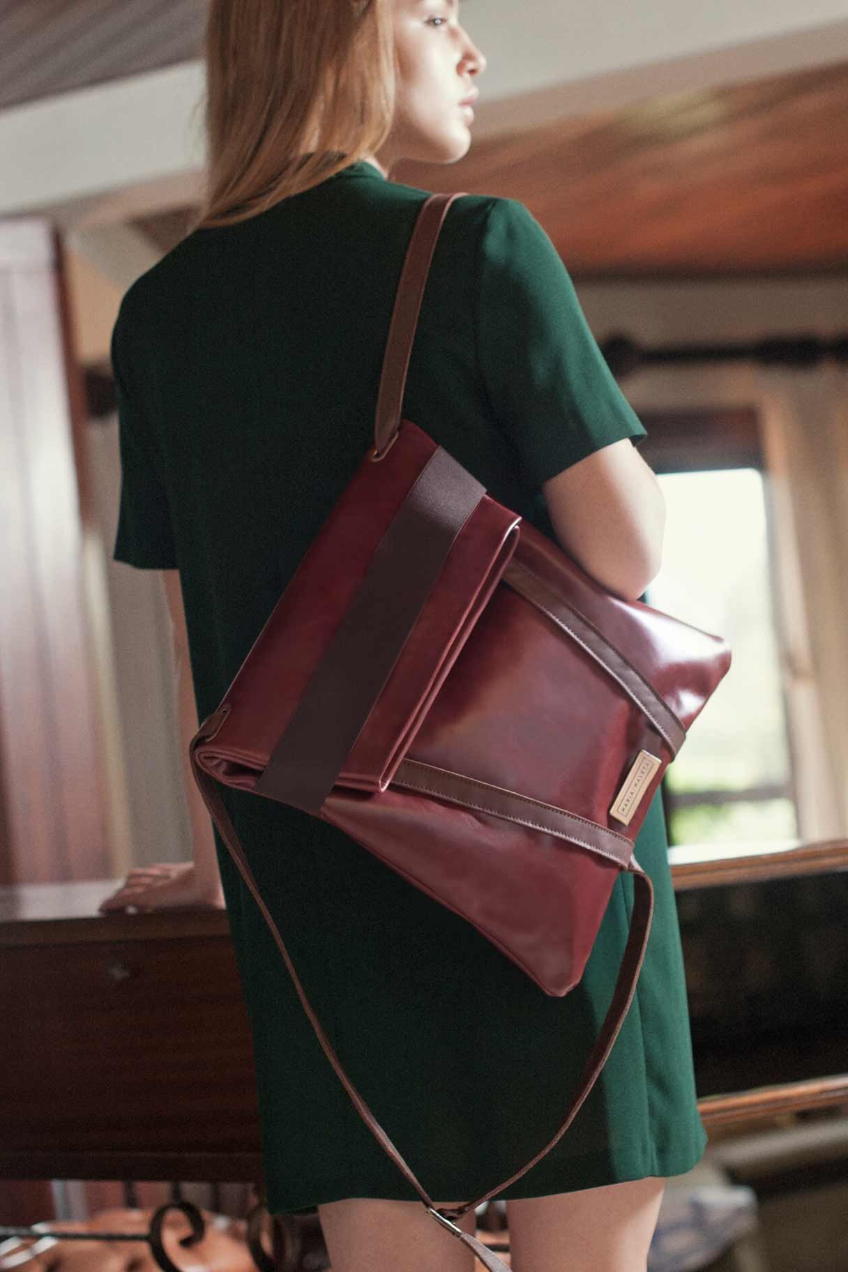 Backpack laptop in bordeaux/brown leather. deep dark brown leather. Brown elastic. Two inner pockets. Dimensions: 35×33 cm. Adjustable straps: 70cm – 80cm.With an extra handle strap. REF. MMVSBPB Made in Portugal
